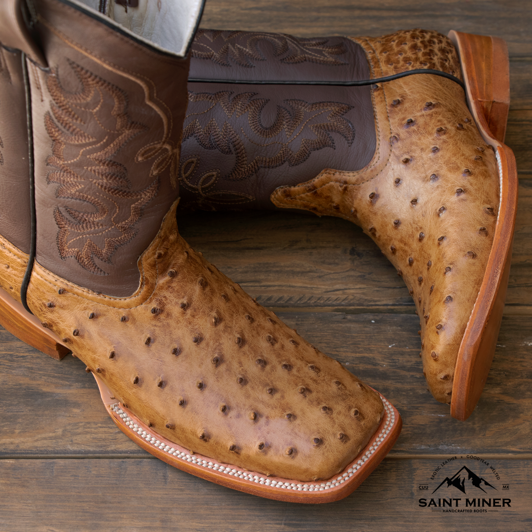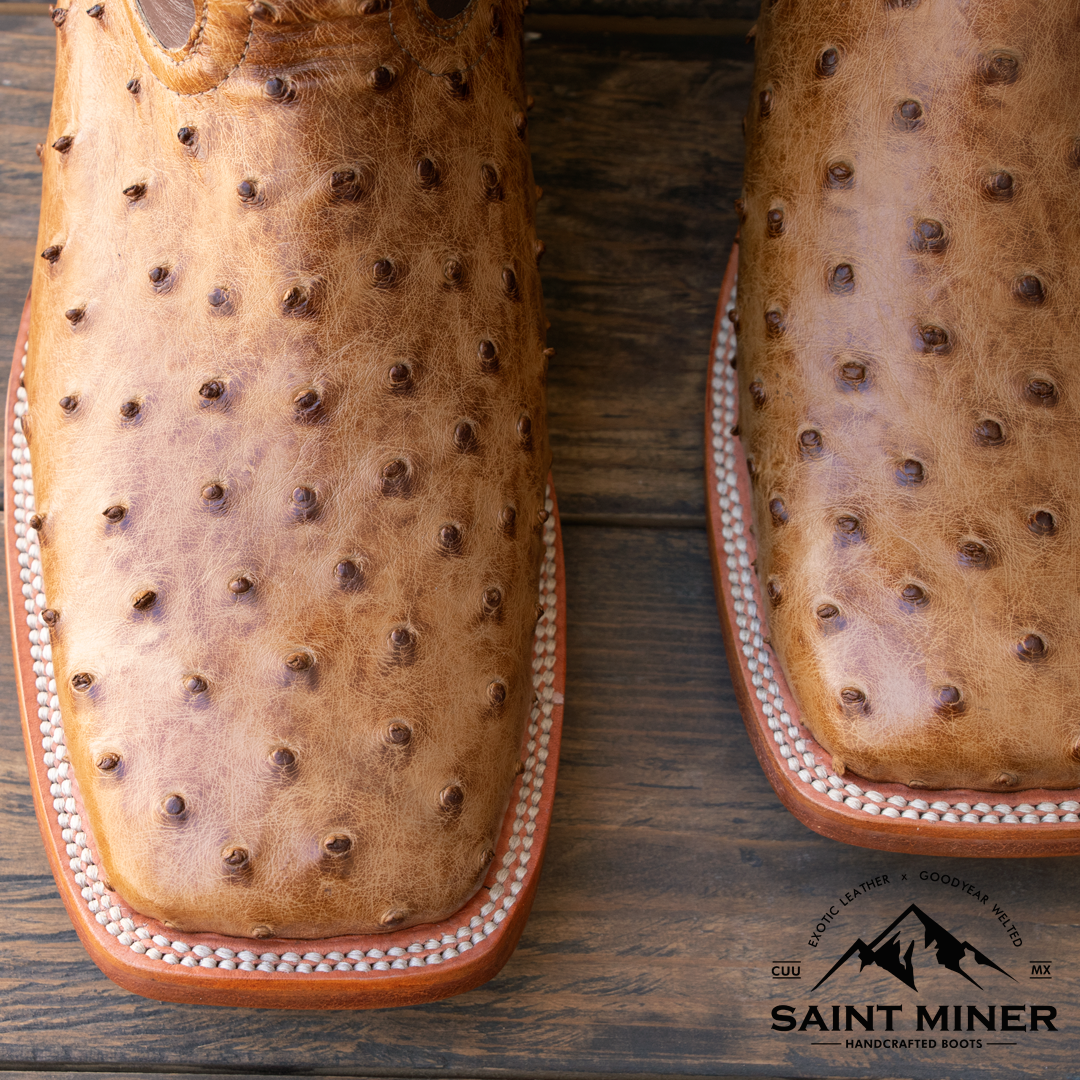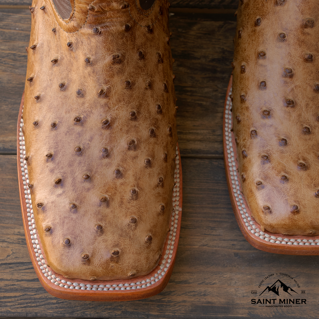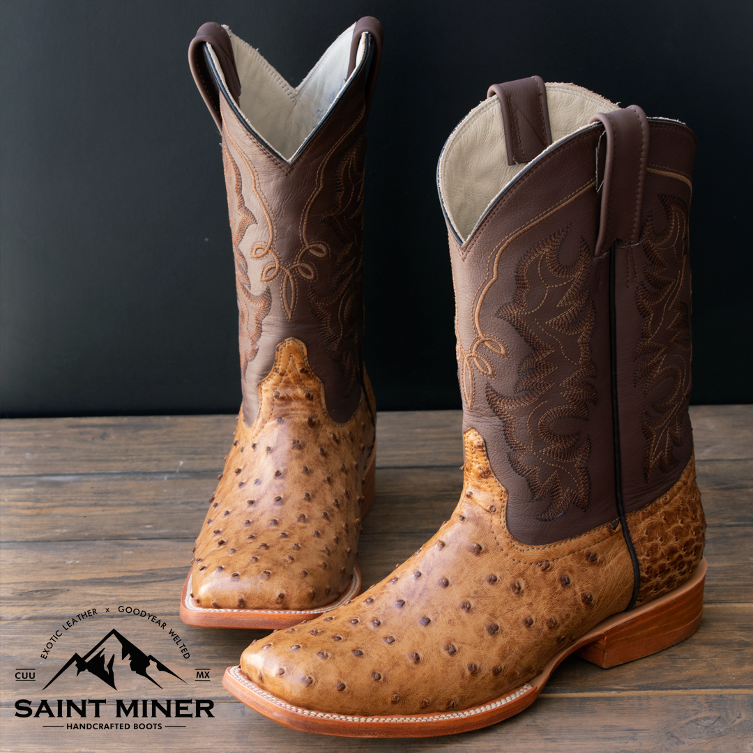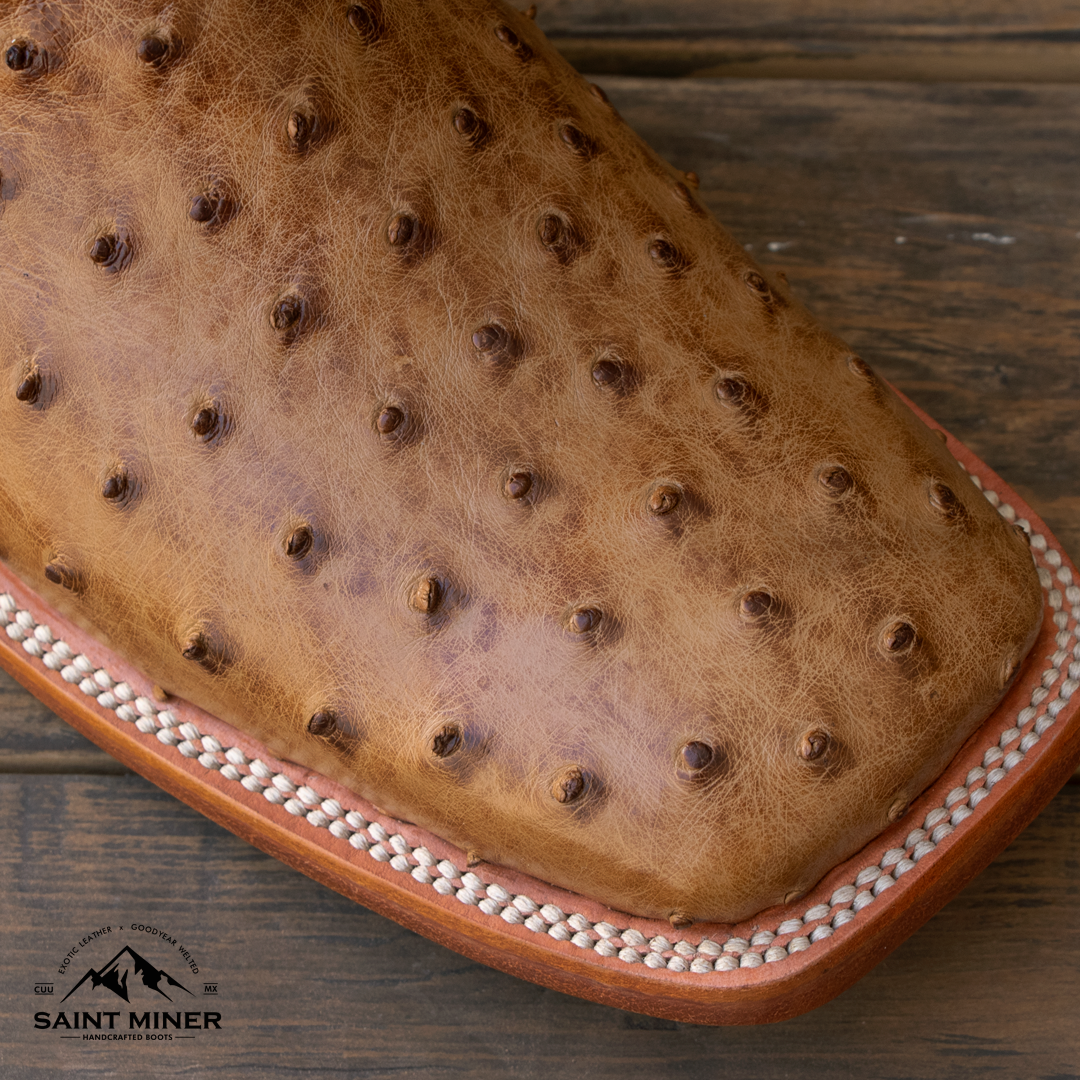 Botas de avestruz en color humber, forro y planta de res, suela de cuero, firme de hule y tacón de lefa. Pespuntado, cortado, montado y ensuelado a mano. El tamaño de la pluma varía en cada pedido y el color puede cambiar hasta un 15% en tonalidad.