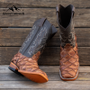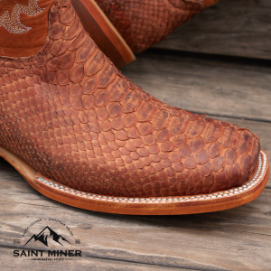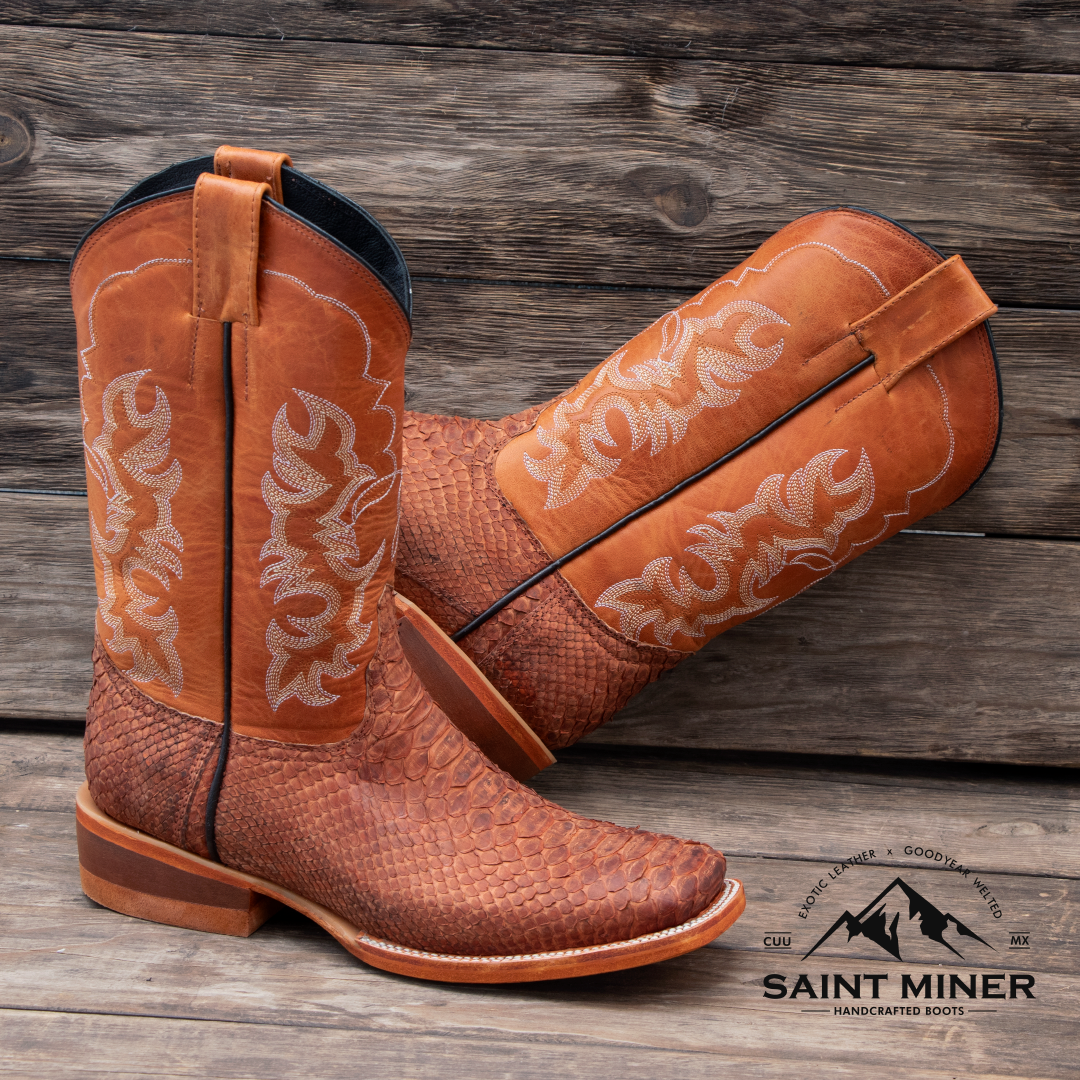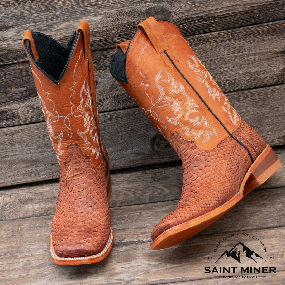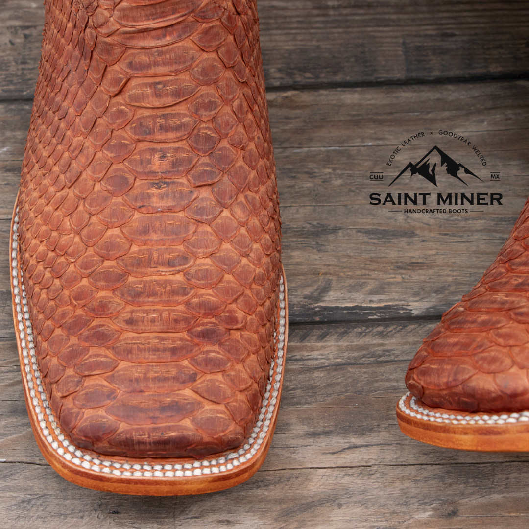 Botas de pitón en color coñac buck, forro y planta de res, suela de cuero, firme de hule y tacón de lefa. Pespuntado, cortado, montado y ensuelado a mano. El patrón de escamas varía en cada par y el color puede cambiar hasta un 15% en tonalidad.