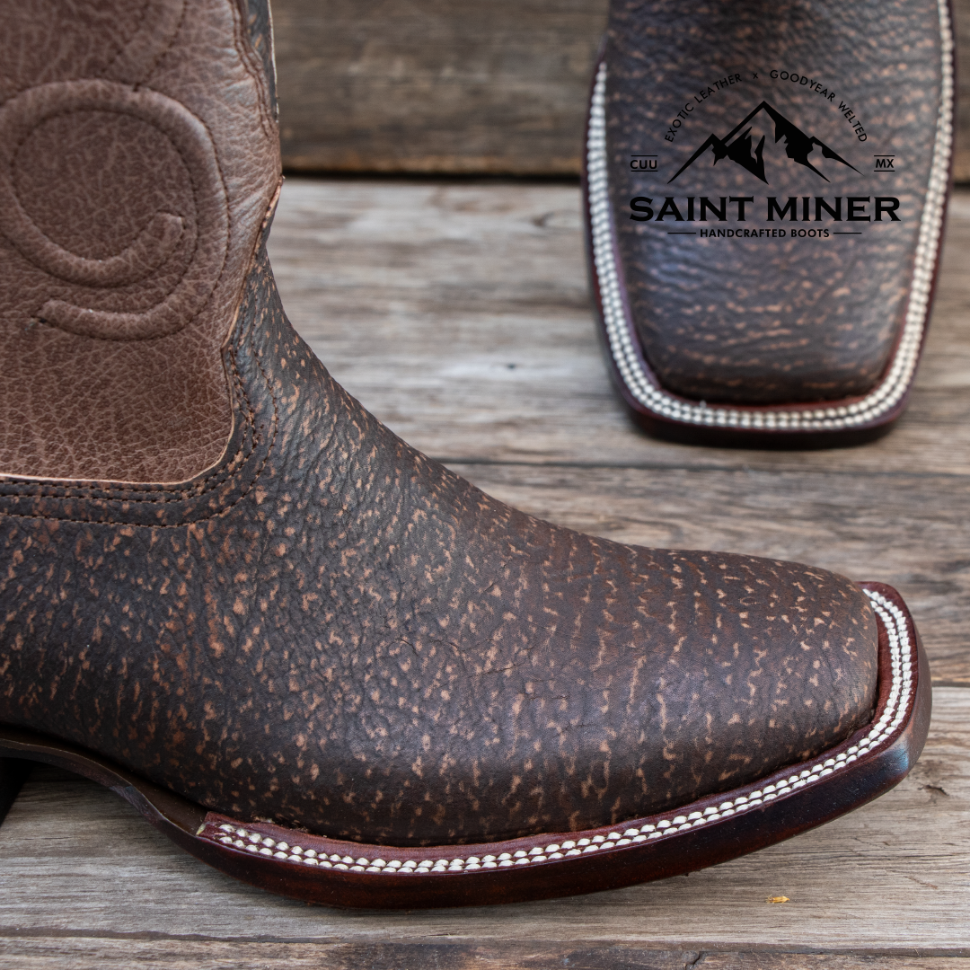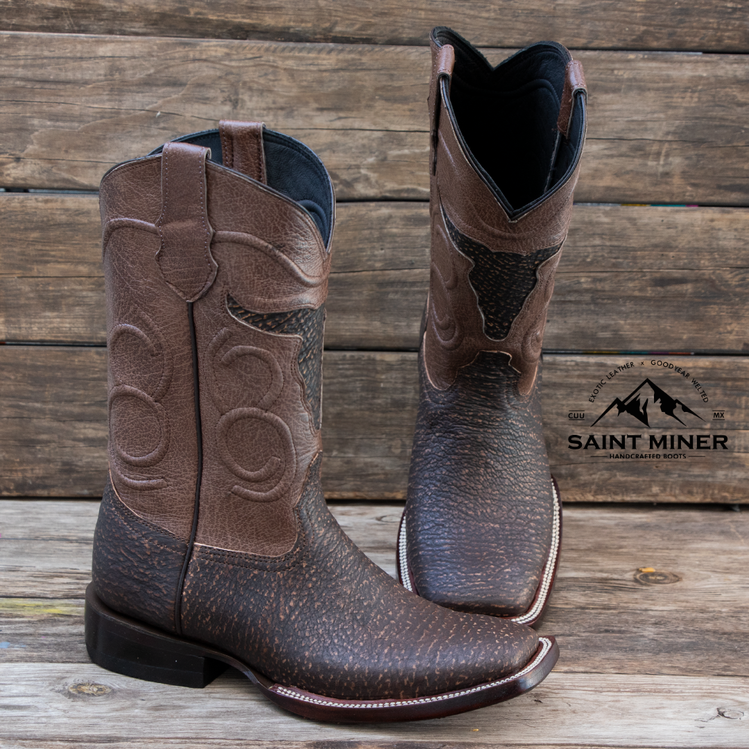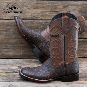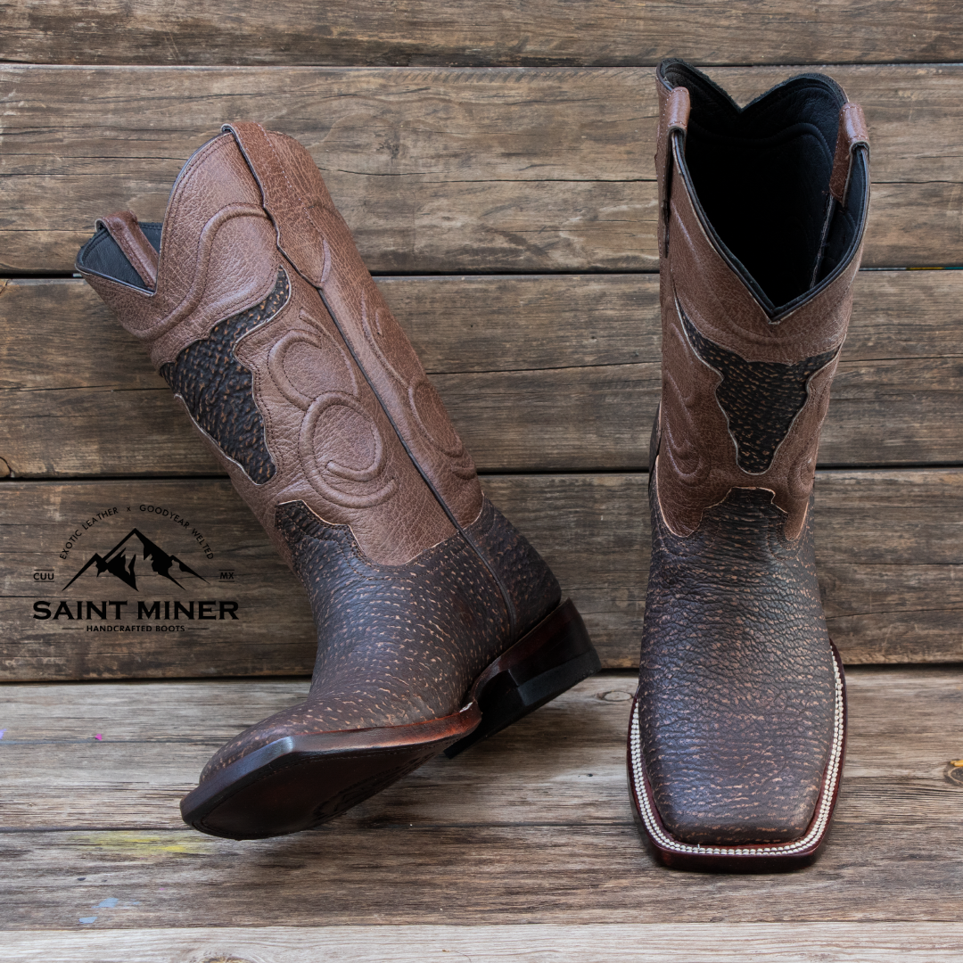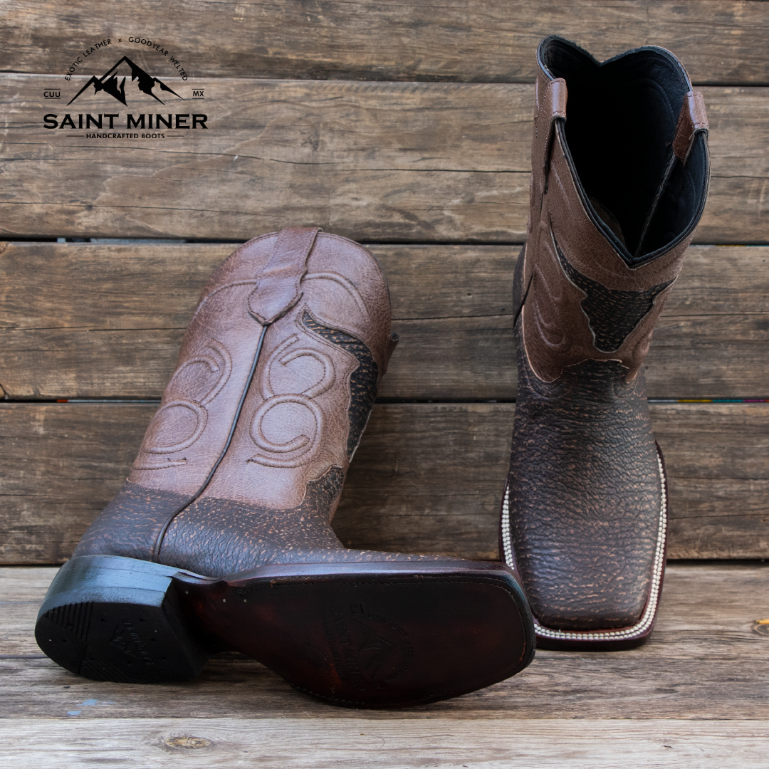 El corte está elaborado en piel de tiburón color Safari, de textura robusta y exclusiva, mientras que el tubo de cabra de exportación aporta suavidad y confort. La suela de cuero genuino asegura durabilidad y elegancia, ideal tanto para la faena como para un evento especial.
